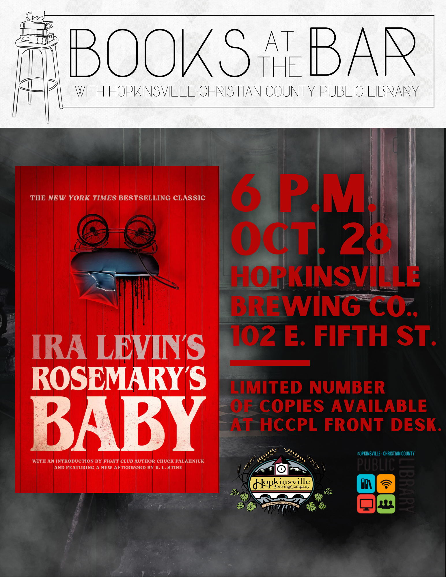 This month we are reading “Rosemary’s Baby” by Ira Levin for Books at the Bar. A limited number of copies are available for check out at the HCCPL Front Desk. We will next meet at 6 p.m. Oct. 28 at Hopkinsville Brewing Co., 102 E. Fifth St.