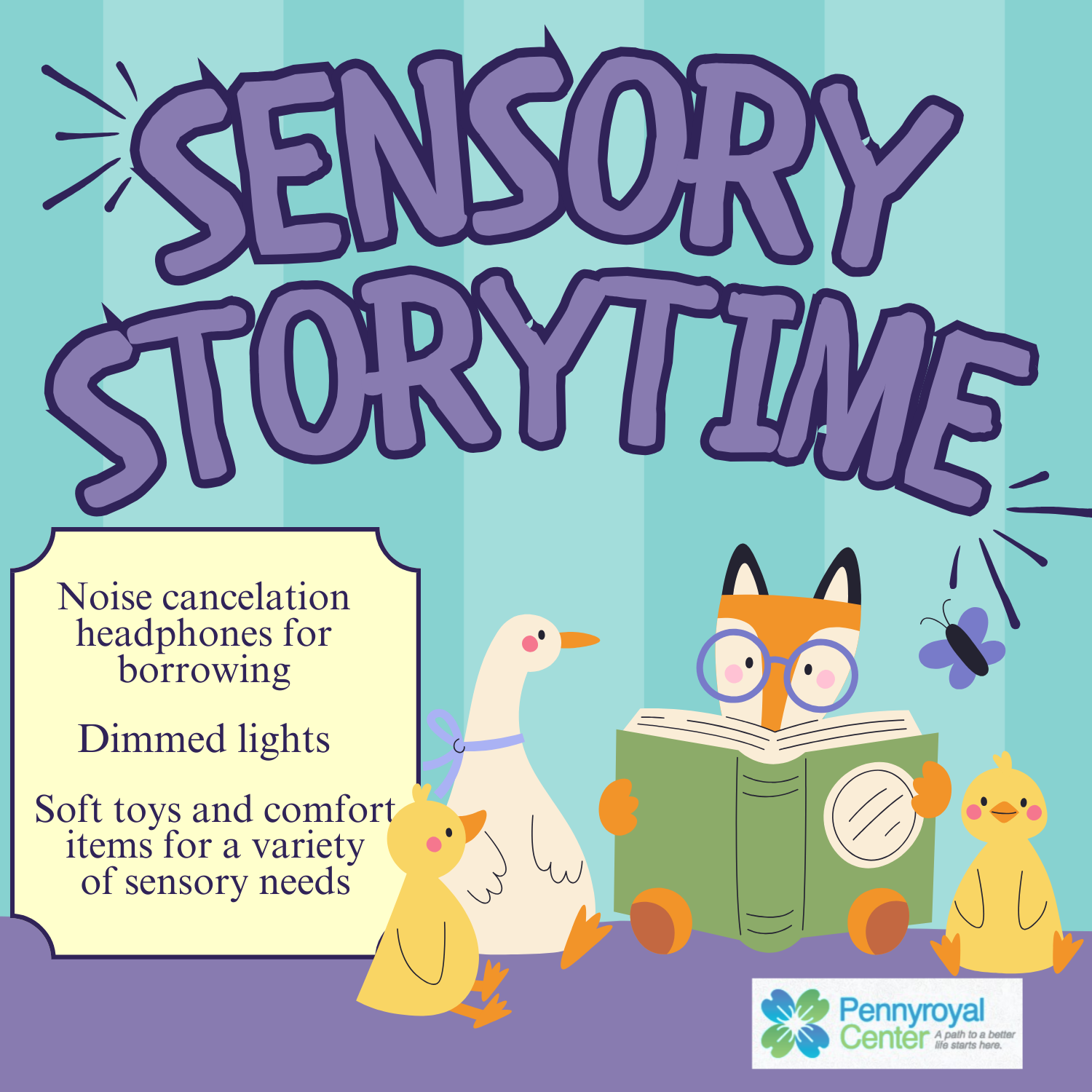 Sensory Storytime is a special time for our friends who prefer a quieter setting. Noise cancellation headphones will be available for borrowing during the storytime. We will have the lights dimmed and also provide soft toys and comfort items for a variety of sensory needs. Special thank you to Pennyroyal Center for providing noise cancelling headphones.