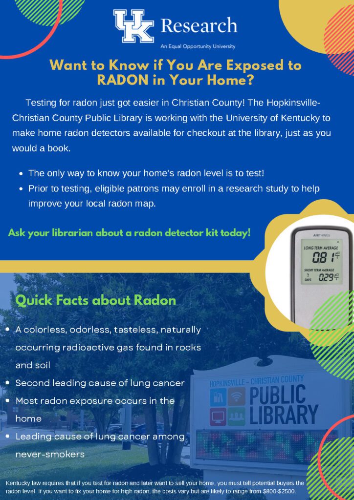 Radon detectors are now available for checkout at the HCCPL front desk, thanks to a research study by the University of Kentucky. Borrowing a kit is simple—just bring your library card.