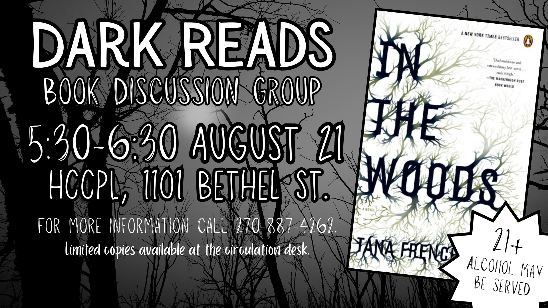 Our Dark Reads Book Discussion Group will next meet 5:30-6:30 p.m. Aug. 21 at Hopkinsville-Christian Co. Public Library, 1101 Bethel St.