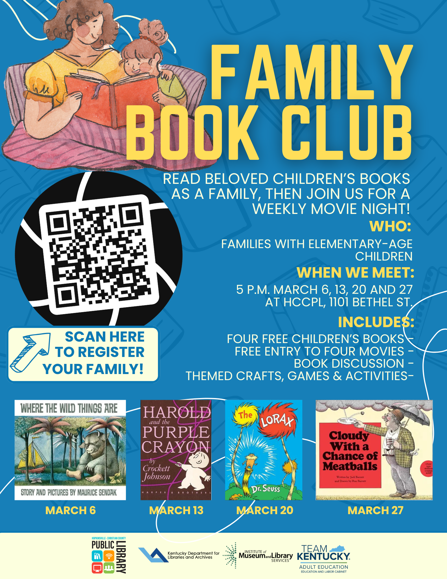 **Registration Required** Family Book Club will meet 5-7 p.m. March 6 to discuss “Where the Wild Things Are” and then watch the movie together! Families