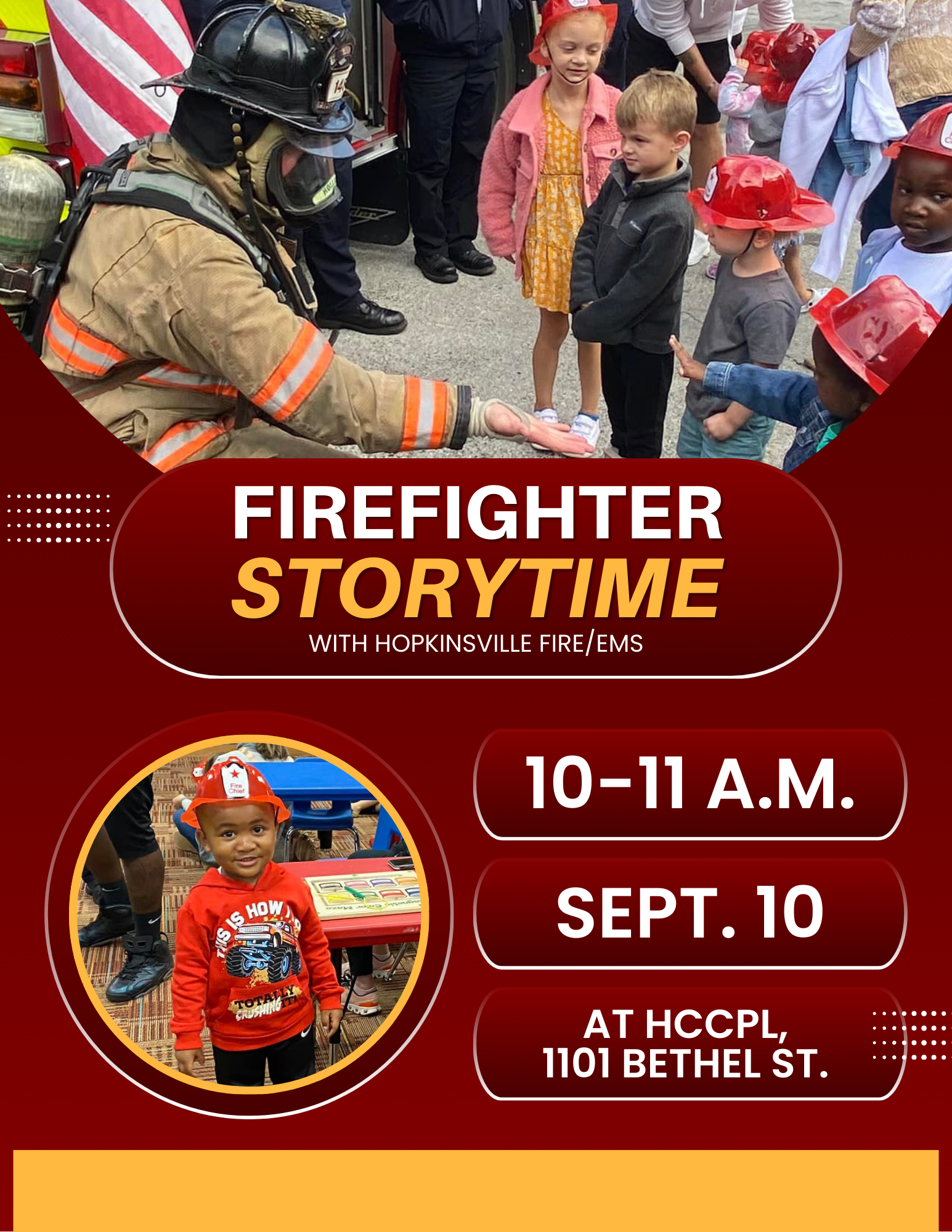 Join us for a very special storytime featuring readers from Hopkinsville Fire/EMS. For preschool-age children. WHEN: 10-11 a.m. Sept. 10 WHERE: Hopkinsville-Christian Co. Public Library,