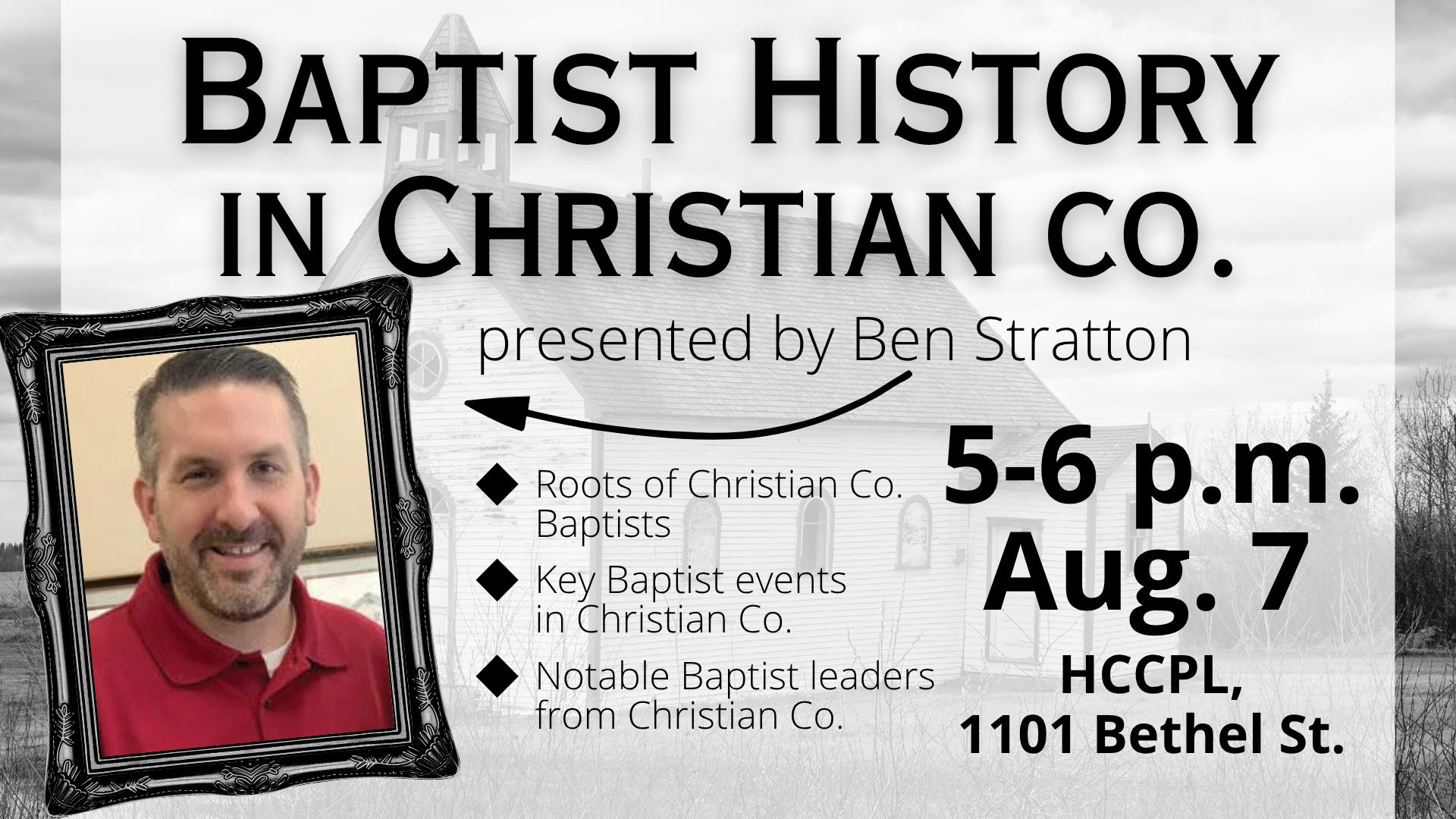 Baptist History in Christian County presented by Ben Stratton Explore Baptist History within Christian County during this free program 5-6 p.m. Aug. 7 at Hopkinsville-Christian Co. Public Library, 1101 Bethel St. July 31, 2025