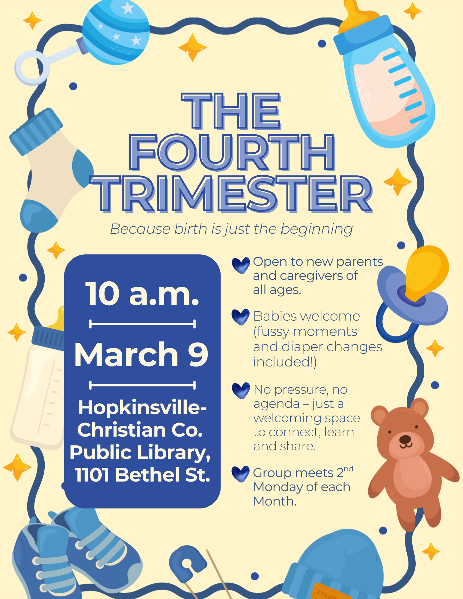 This is a casual gathering for new parents and caregivers. The group will next meet 10-11 a.m. March 9 at Hopkinsville-Christian Co. Public Library, 1101